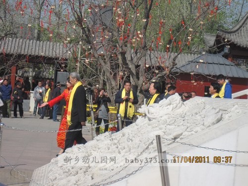 感慨和思维在脑海里游走着,眼前的一切也真实的进行着,不知不觉的大典要开始了,震人心昡的礼炮把自己的思绪带了回来。大典开始进行这九项议程,分别为:盛世礼炮,敬献花篮,净手上香,行施拜礼。恭读拜文,高唱颂歌,乐舞敬拜,祈福中华,天地人和。礼炮后,群峰教育李老师和领导嘉宾先后敬献花篮,净手上香,鞠躬致敬。他们的每一次鞠躬都诠释着我们幼教界的每一个人对轩辕黄帝的崇敬和尊仰。
