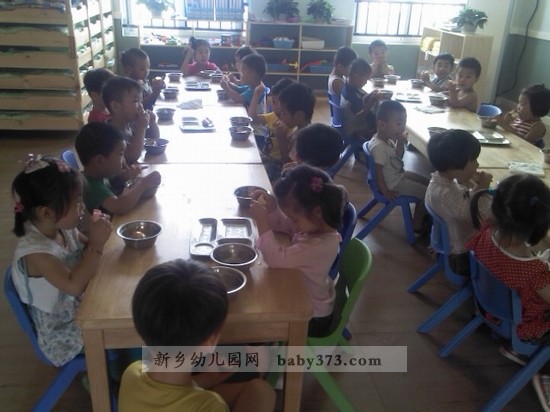 保健医细心讲解幼儿营养食谱,孩子们按年龄分到各班,第一次和新小朋友共进水果加餐。