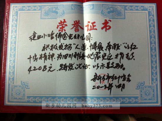 为培养孩子关爱他人,热心助人的意识,向雅安的小伙伴伸出援手、提供帮助;新乡建业小哈佛金龙幼儿园特向全园师生发出倡议书,开展“为雅安加油”募捐活动,为雅安祈福,向雅安伸出援手。 孩子们省下买玩具、零食的零用钱,纷纷伸出援助之手,为雅安灾区捐款。灾难无情,人间有爱。此次捐款次日由小哈佛金龙幼儿园老师和幼儿代表上缴新乡市红十字会,由红十字会统一协调,有组织地运往灾区。 “伸出你的手,奉献你的爱”,希望新乡小哈佛金龙幼儿园全体师生的这份爱会为灾区的小朋友带去一丝温暖。