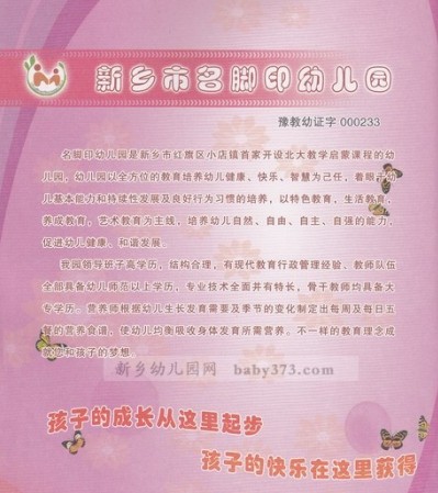 新乡市名脚丫幼儿园现招聘幼师,欢迎加入我们的团队 。新乡市名脚丫幼儿园是新乡市红旗区小店镇首家开设北大教学启蒙课程的幼儿园,幼儿园以全方位的教育,培养幼儿健康、快乐、智慧,着眼于幼儿基本能力和持续性发展及良好行为习惯的培养,以特色教育,生活教育,养成教育,艺术教育为主线,促进幼儿健康和谐的发展。