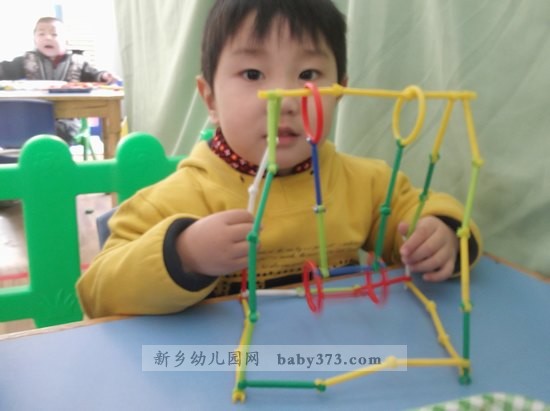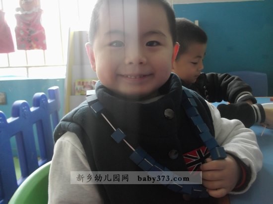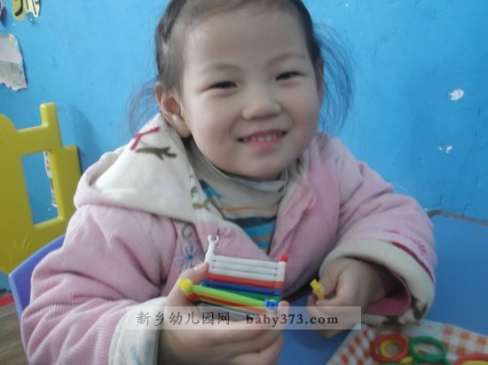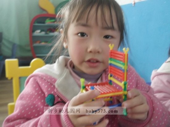 小朋友们,你们好啊!快看,这是我们用积木搭建的秋千、椅子。还有我用珠子给妈妈穿的手链。