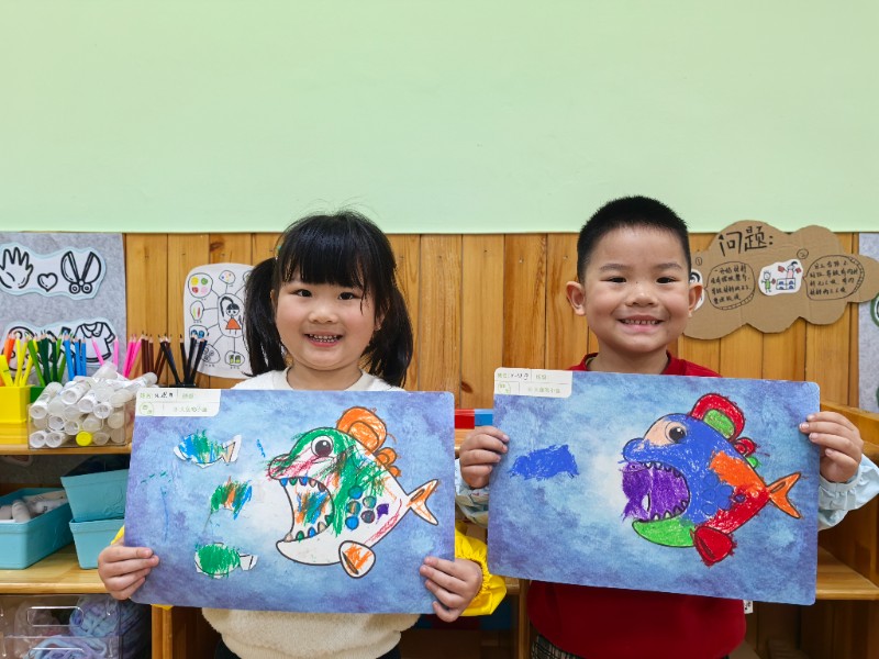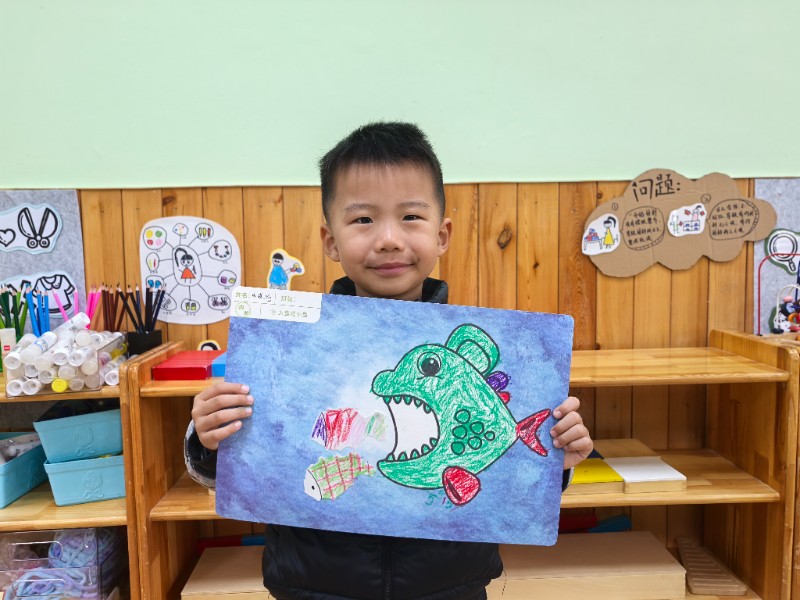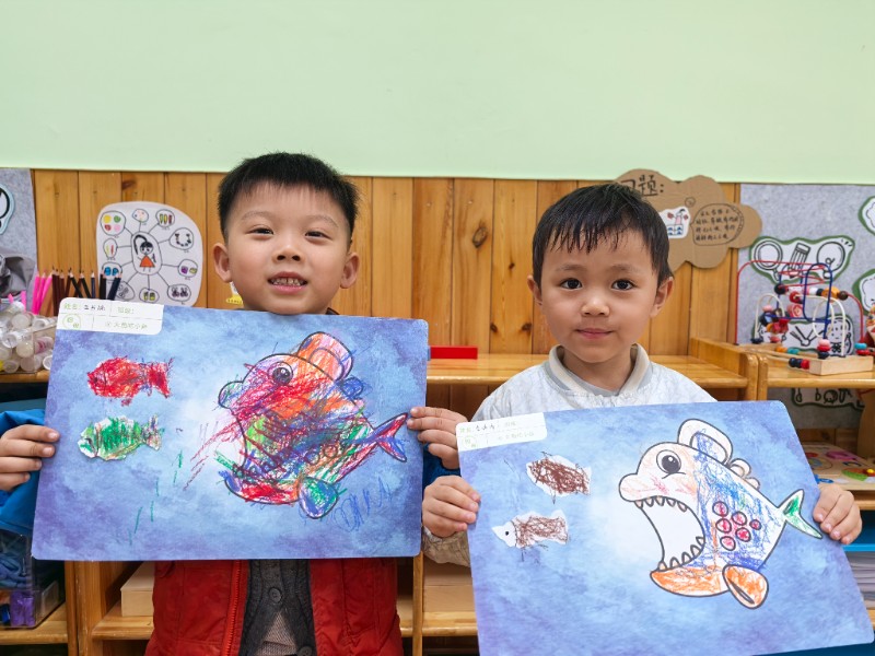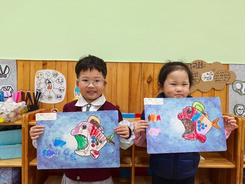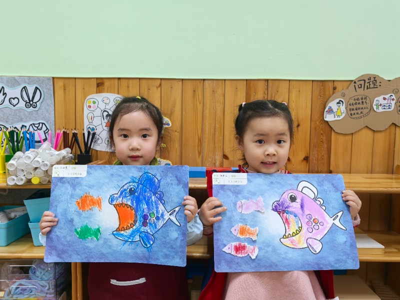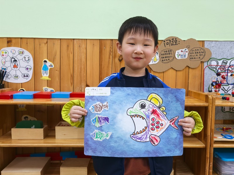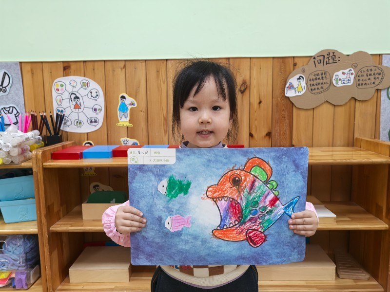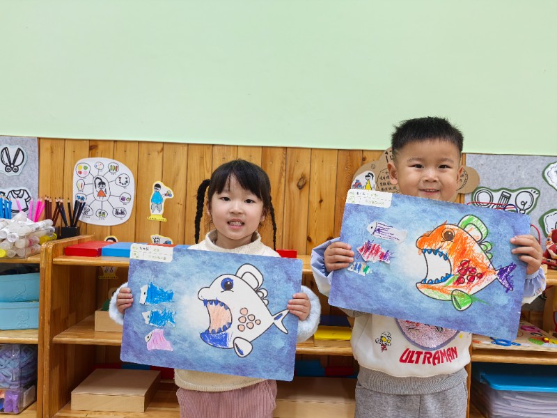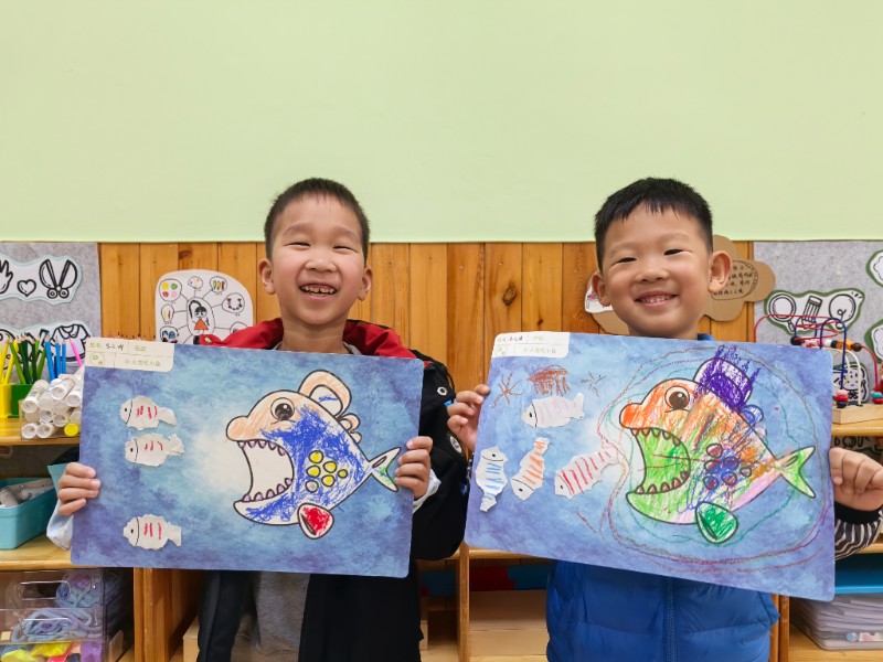 今日美术活动——大鱼吃小鱼。一张普普通通的白纸,在孩子们的创意下经过撕、粘、添画等方法后变成了一只只可爱的小鱼。孩子们的智慧在手指尖上凸显出来,既新颖别致,又能锻炼手指肌肉的灵活性。