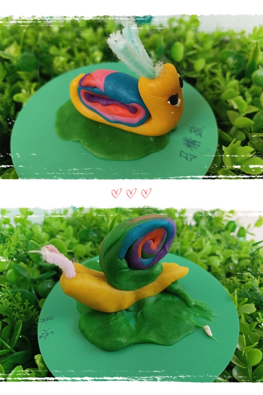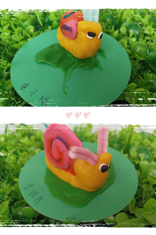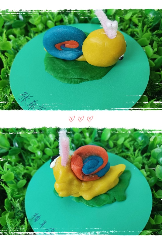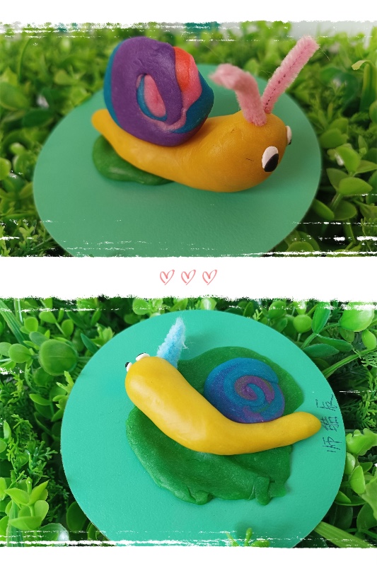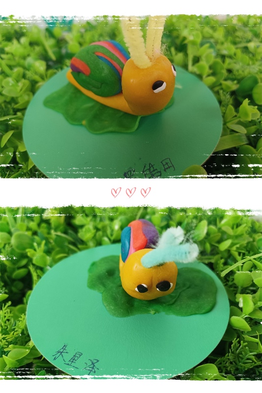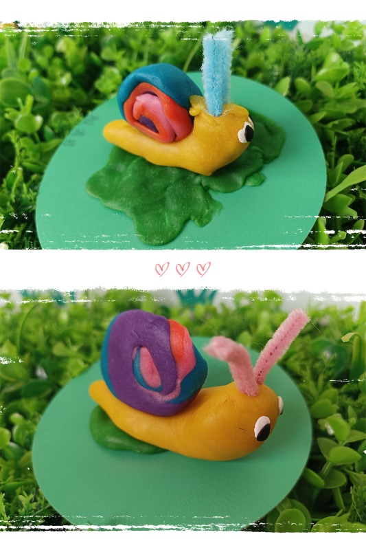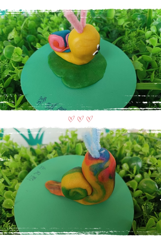 今天我们开展了面塑活动——《彩虹蜗牛》。活动中,让幼儿了解蜗牛的外形和生理特征。 学习搓长条、水滴及卷叠的制作方法,掌握水滴及卷叠的粘合。培养幼儿热爱大自然、保护大自然的强烈意识。