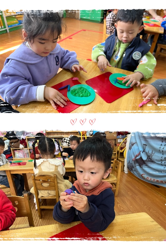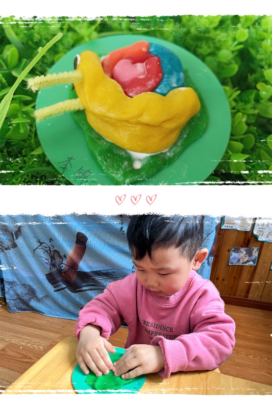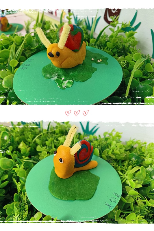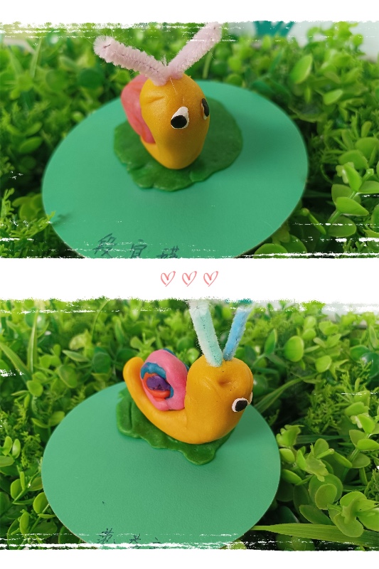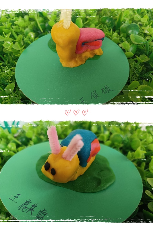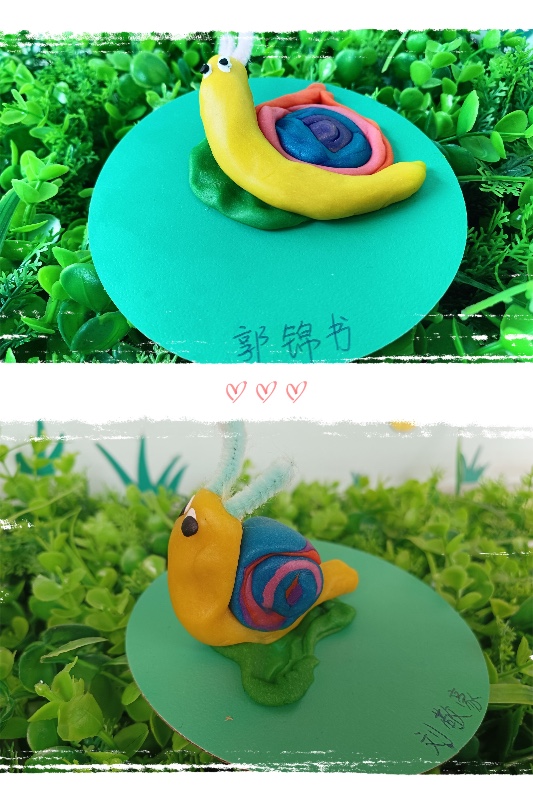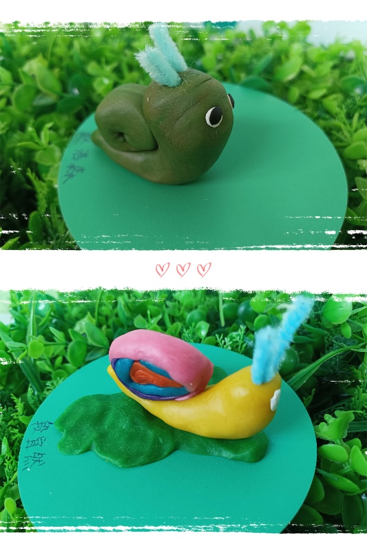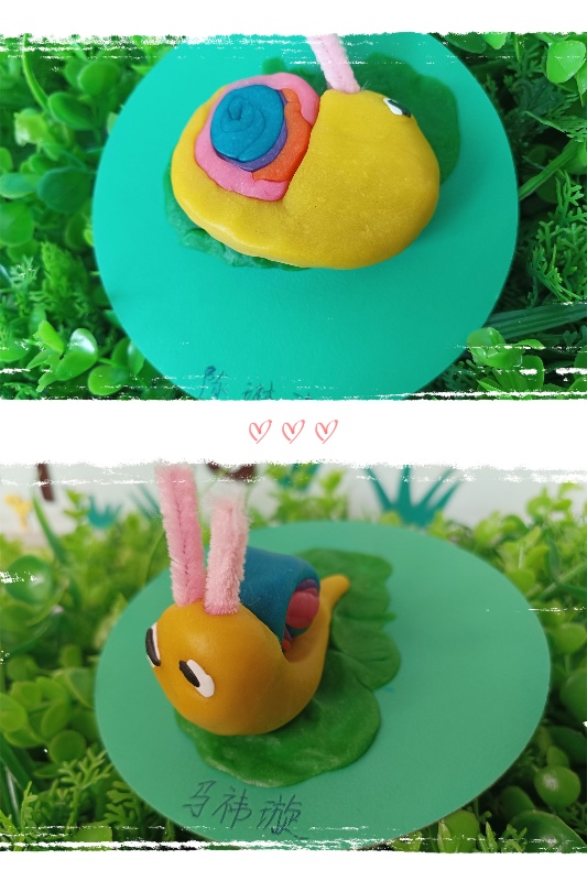 今天我们开展了面塑活动——《彩虹蜗牛》。活动中,让幼儿了解蜗牛的外形和生理特征。 学习搓长条、水滴及卷叠的制作方法,掌握水滴及卷叠的粘合。培养幼儿热爱大自然、保护大自然的强烈意识。