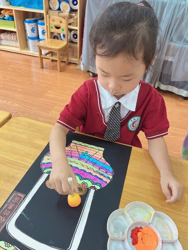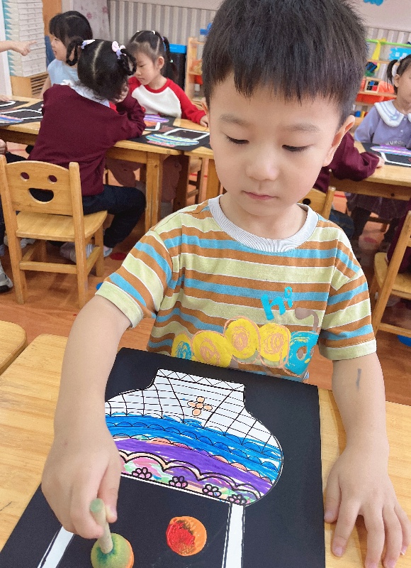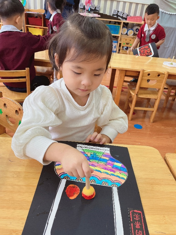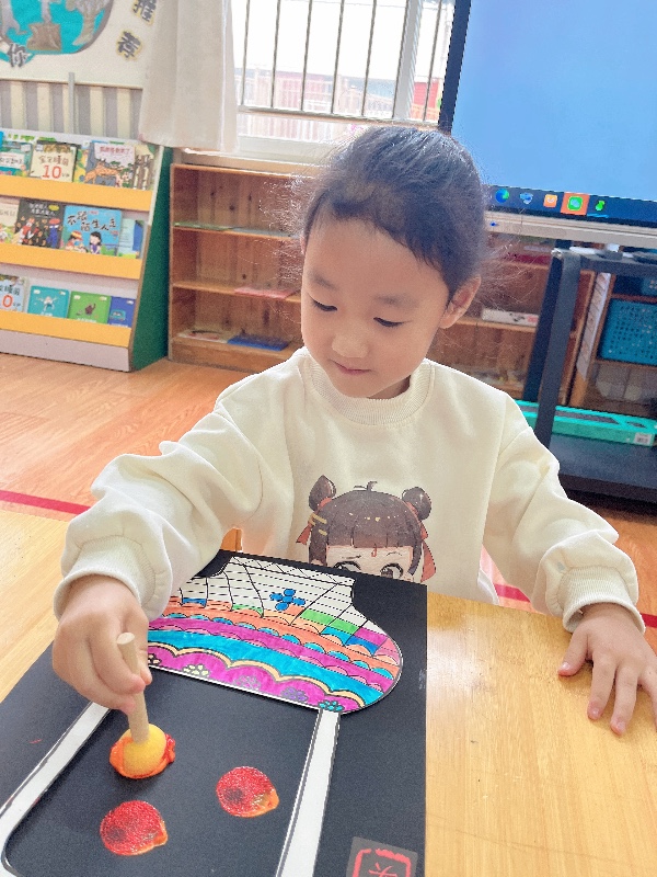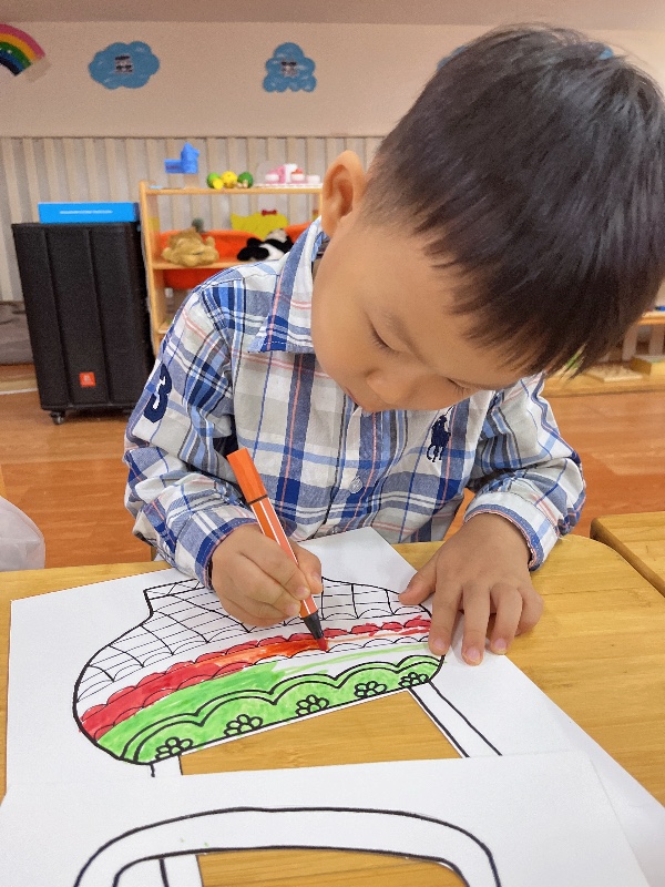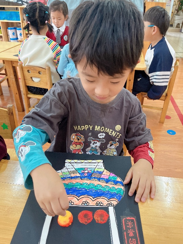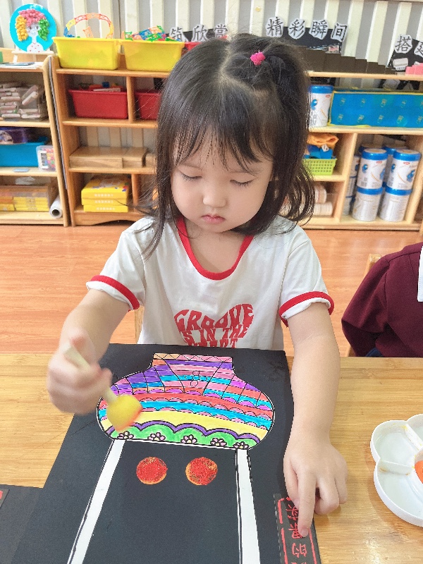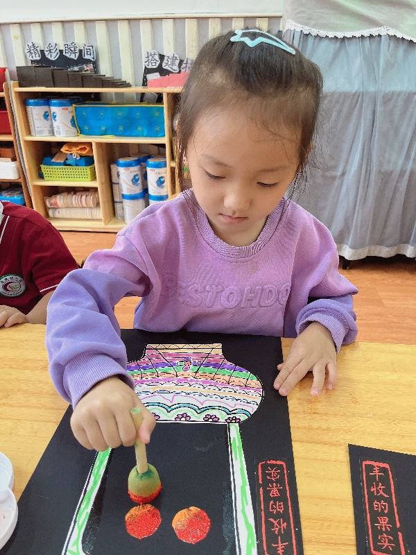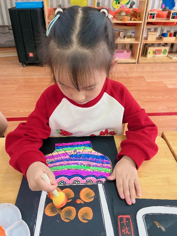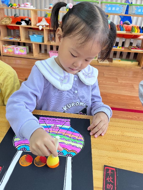 给篮子涂上喜欢的颜色🎨、加上装饰,再用海绵印章印出果实🌟。 一幅充满秋意的画就完成啦~ 秋天的丰收感,狠狠拿捏住~😉