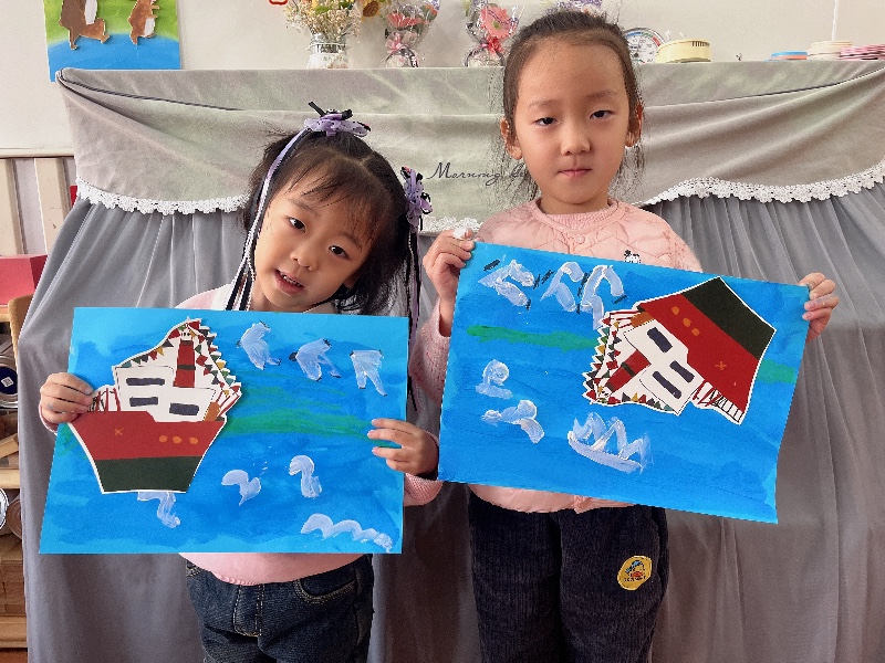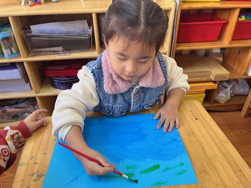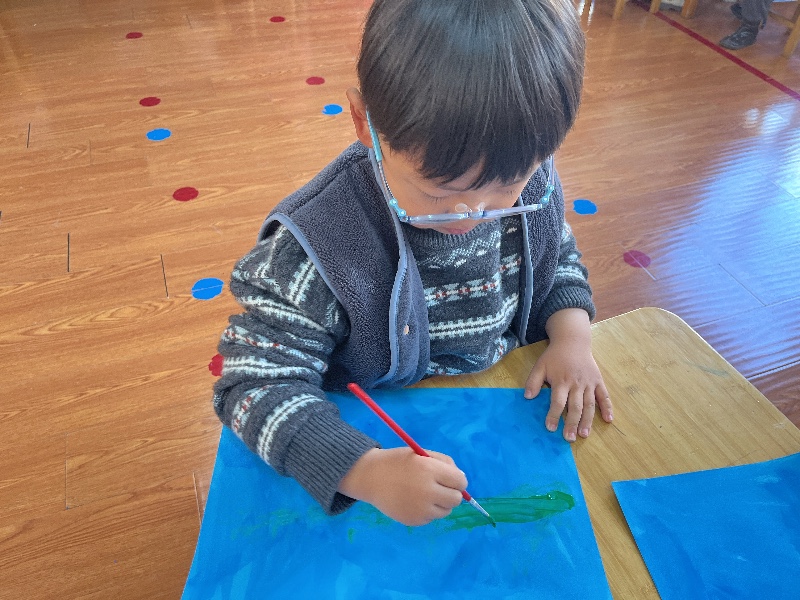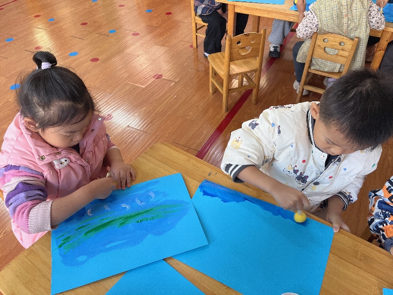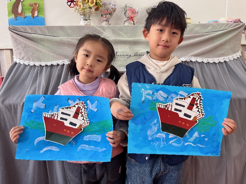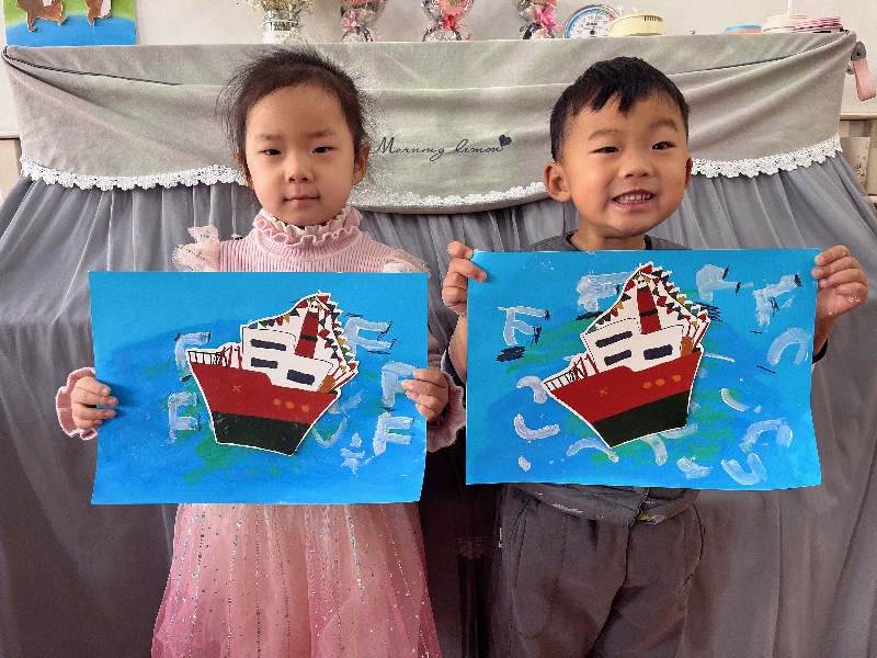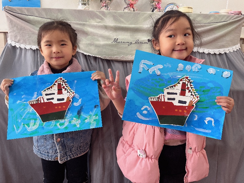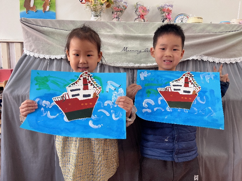 从认真刷色的专注,到收获‘航海大作’的开心🥳 蓝颜料里藏着的,是属于小朋友的大海和船🚢
