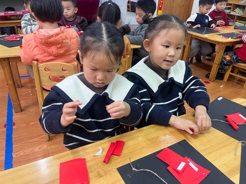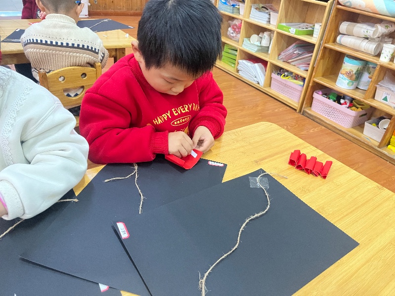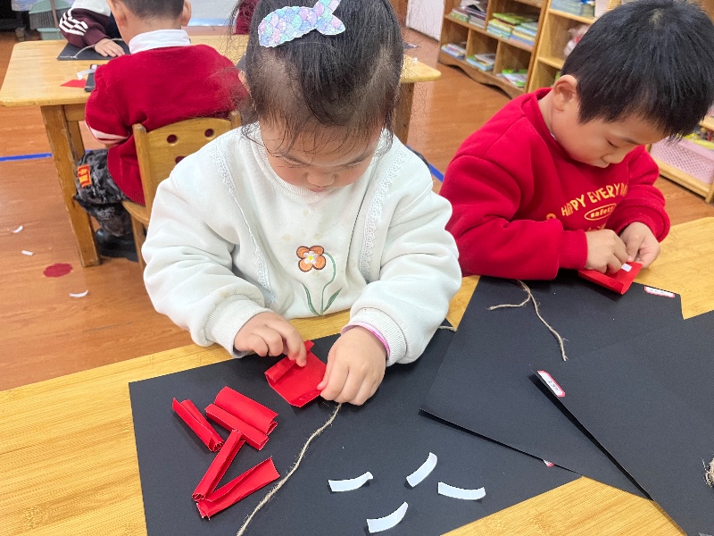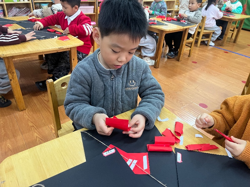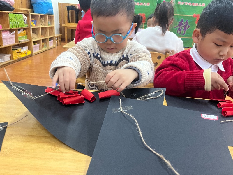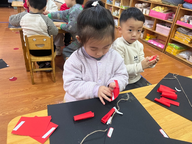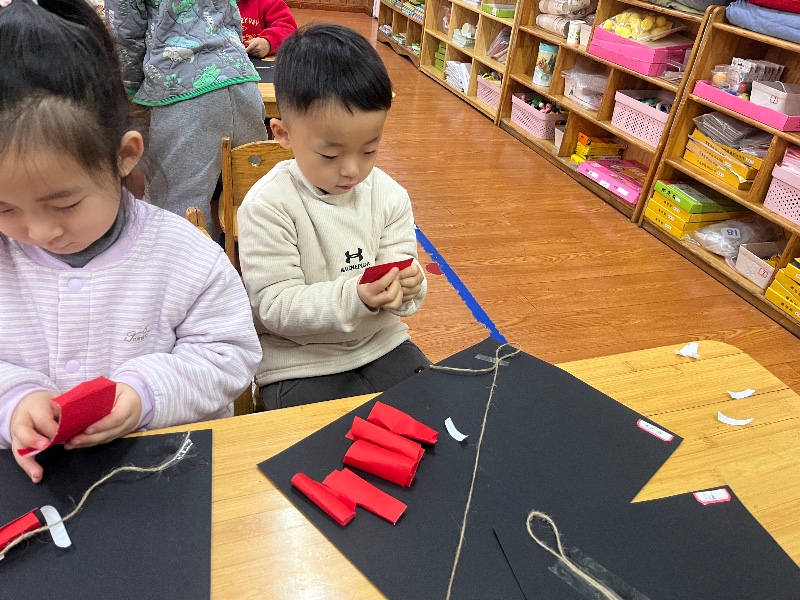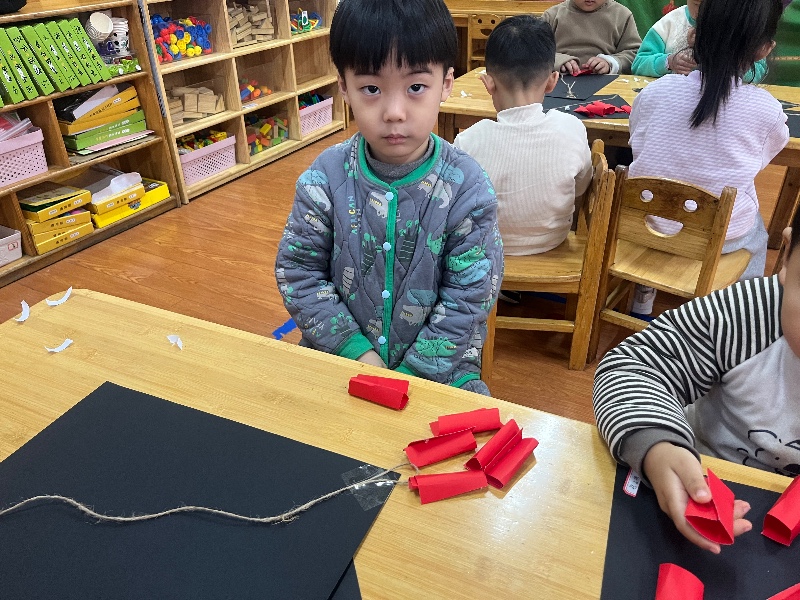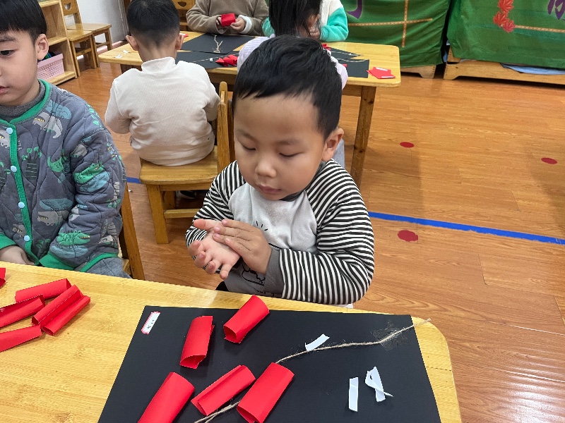 红红火火迎新年,幼儿园里鞭炮响!用彩纸卷成“小炮筒”,金纸条贴出“引信”,红绳串起“噼里啪啦”的祝福。每一步都藏着年味儿,每串鞭炮都像在说:“新年到,好运到!”